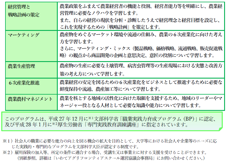 ※ 専門実践教育訓練に係る支援を受けようとする場合は、受講開始1カ月前までに岩手労働局等に申請する必要があるため、「いわてアグリフロンティアスクール運営協議会事務局」にその旨お申し出ください。